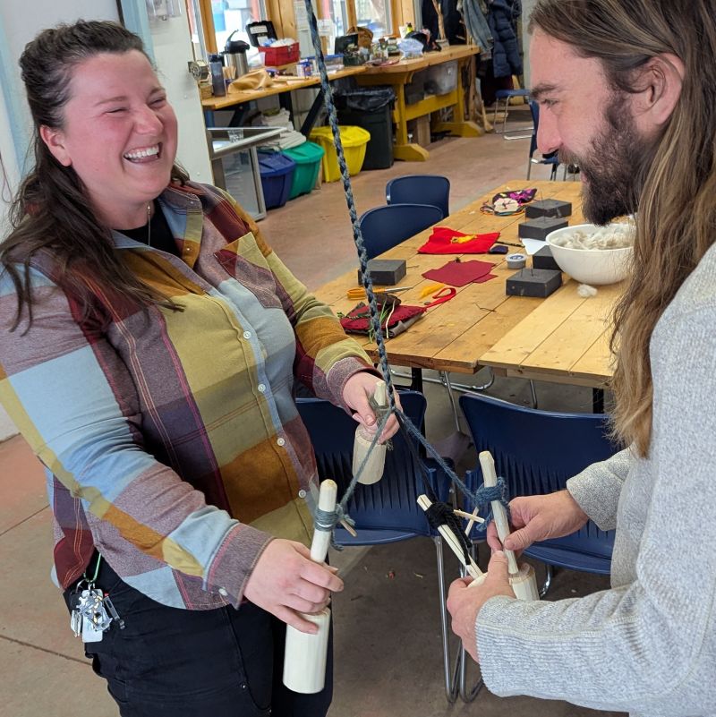 A very ancient, very fast, and very fun craft, Jugglebraiding is a two-person fiber craft which can be used to create shoelaces, drawstrings, bracelets, ropes, and bowstrings. It is easy to set up and brings a lively energy to any workshop!
