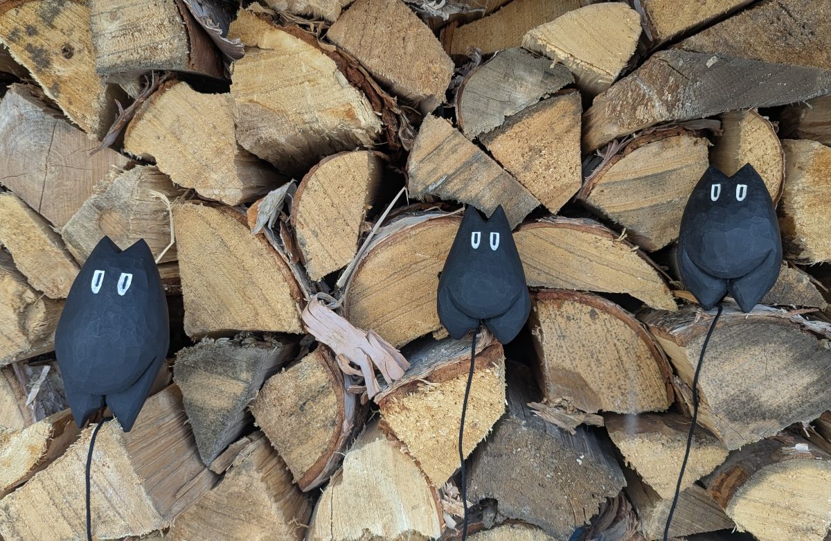 pine, wire, yarn, milk paint, walnut oil, 1oz fishing weight