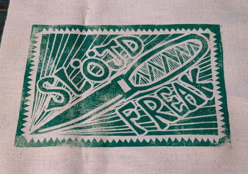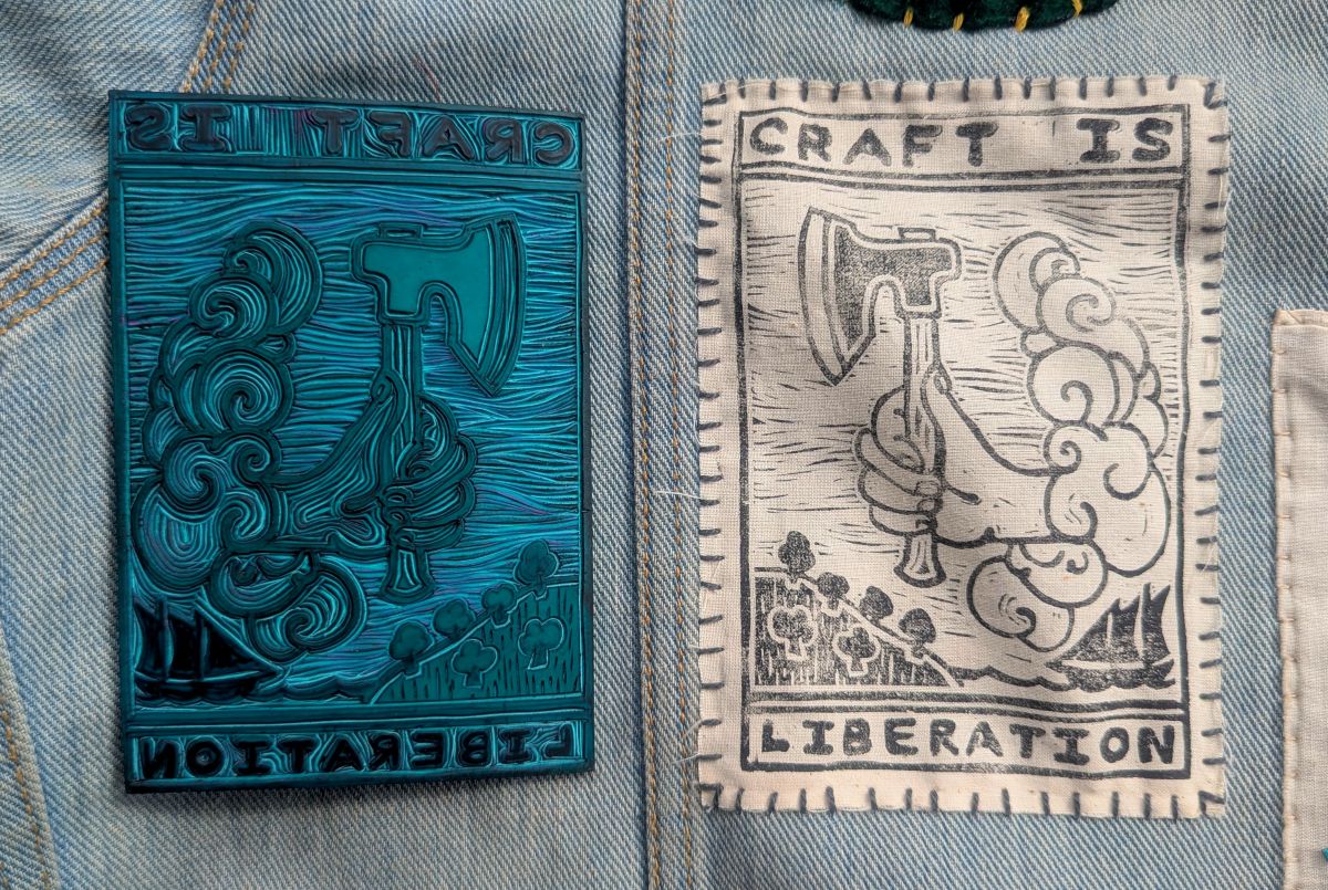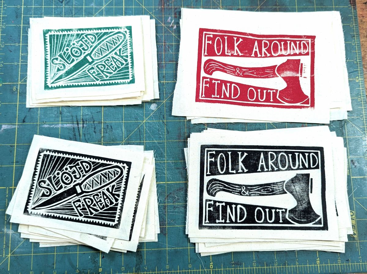 I have been making patches using lineoleum and wood blocks for quite some time. I find that patches can be an excellent way to declare your identity, spread an idea, or mend a hole in your pants. You can find some of my Slöjd Freak, Folk Around and Find Out, and Craft is Liberation patches for sale at North House Folk School!