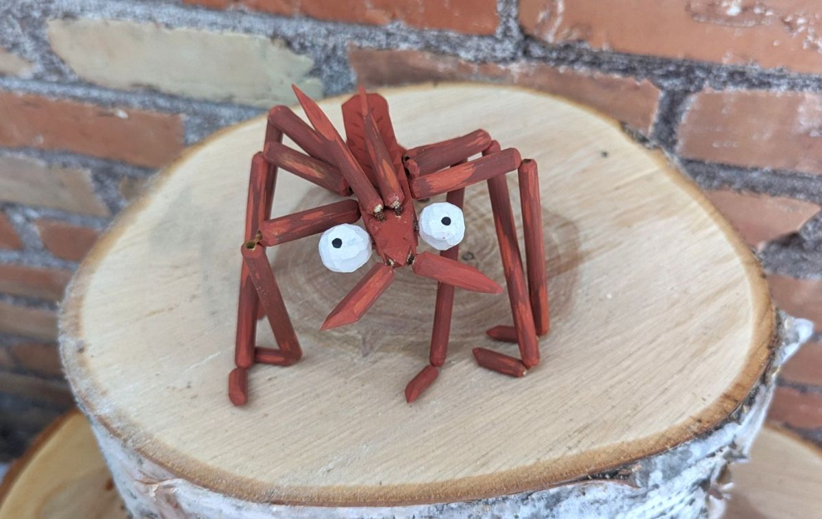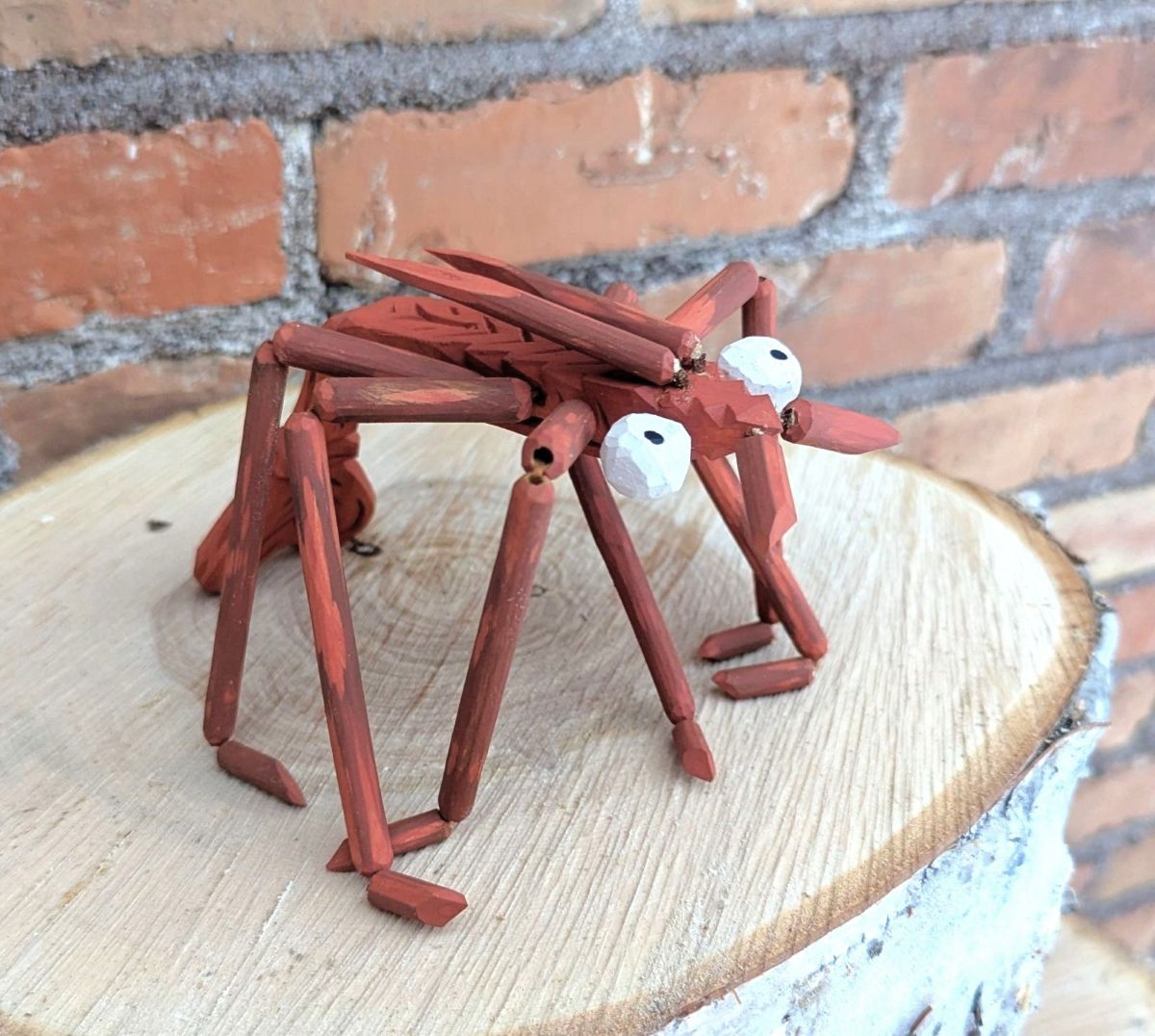 This gangly creature is fully articulated and clacks as he moves. His tail, antennae, and bulging eyeballs are attached by a tightly-fitted leather cord, and his legs are hollow dogwood stems laced with embroidery thread.